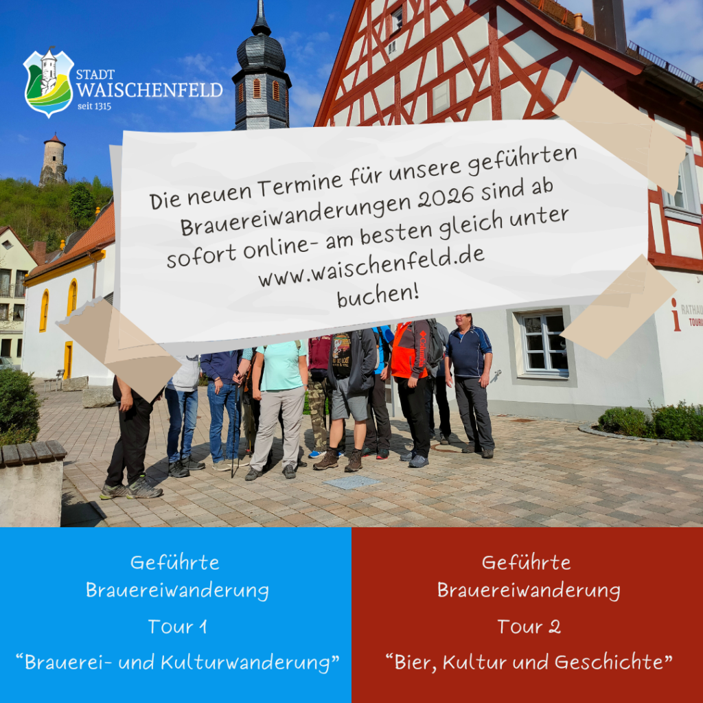Die neuen Termine für unsere geführten Brauerei- und Kulturwanderungen in und um Waischenfeld sind ab sofort online und hier auf der Website buchbar- am besten direkt reinschauen und buchen unter der Rubrik „Tourismus“ Brauerei-, Kulturwanderungen & Stadtführungen | Stadt Waischenfeld